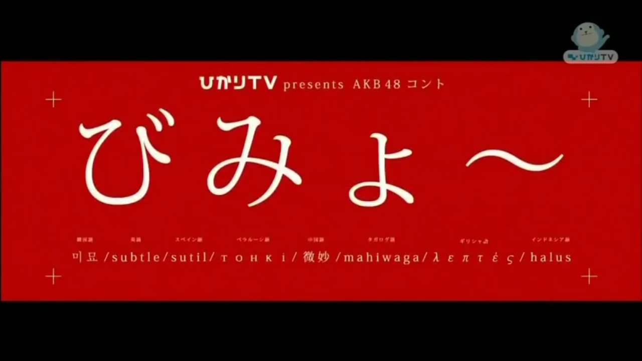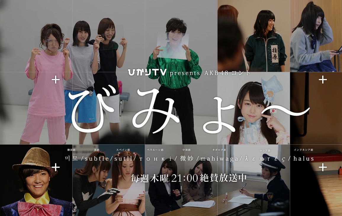 旅少女、コントびみょ~、今夜はお泊りの3つだけらしい 975 47の素敵な (茸) (スプッッ Sd5a0snq) (火) ID7GZuV1Ed YoutubeからSHOWROOM動画消されるのが加速しそう. 『ひかりTV presents AKB48コント「びみょ〜」』(ひかりティーヴィー プレゼンツ エーケービー フォーティエイト コント びみょ〜、略称:びみょ〜)は、ひかりTVチャンネル1で11年 9月29日から12年 2月23日に配信されていたAKB48のコント番組。. DVD BOX 特典生写真 柏木由紀 ひかりTV AKB48 コント びみょ?.