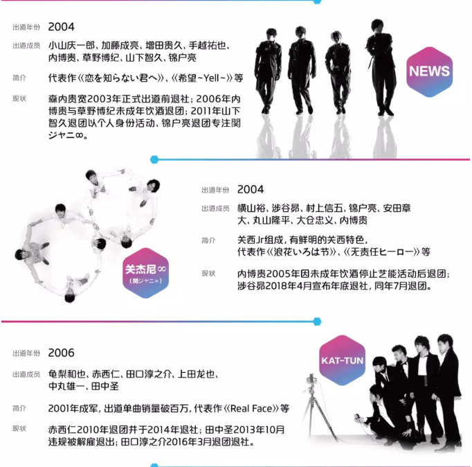Kat Tun成員赤仁西 左三 離隊 田中聖 左二 被辭退 田口淳之介 右二 退團 剩下3名成員作個人發展 明周娛樂