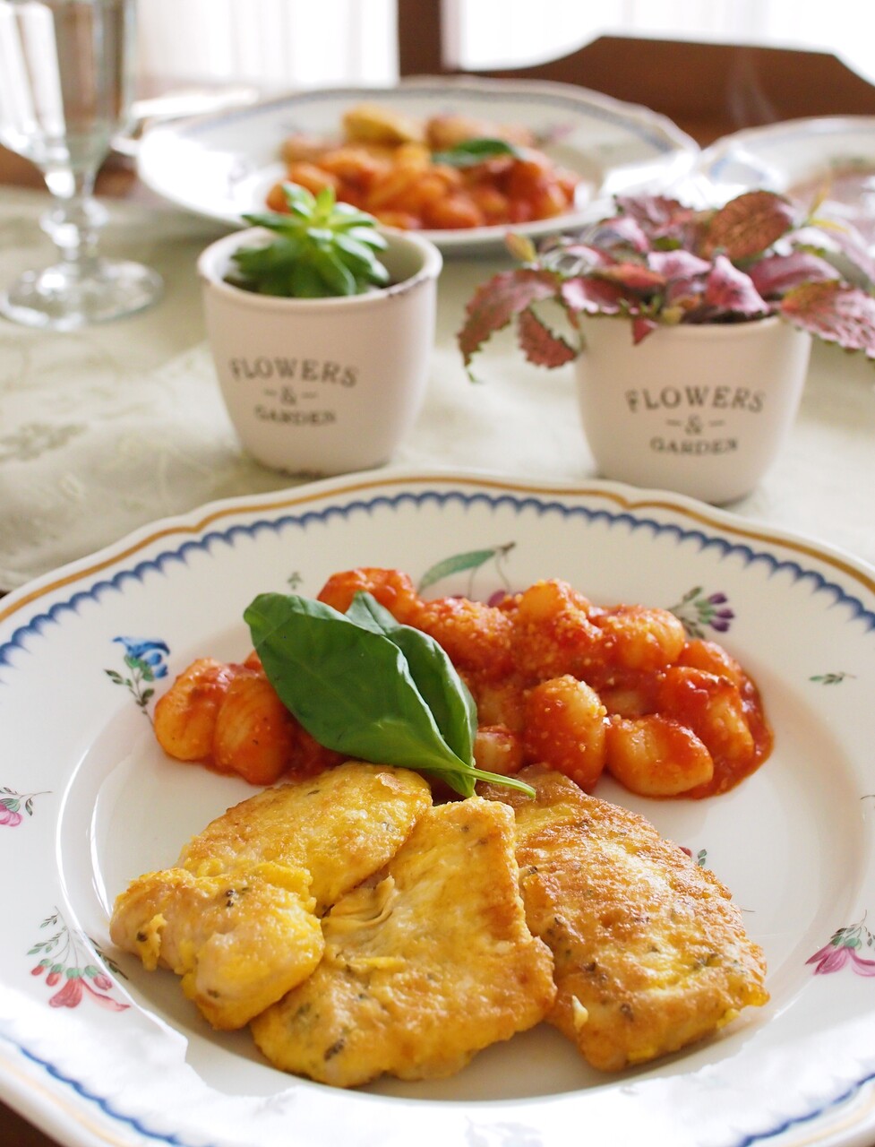 柔らか鶏むね肉のハーブ風味ピカタ ポテトニョッキのトマトソース 気まぐれキッチン Andante