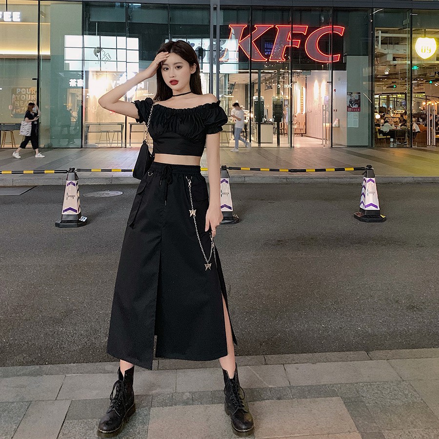 夏季套裝女新款一字領露肩黑色性感上衣高腰顯瘦開叉半身長裙1456 蝦皮購物