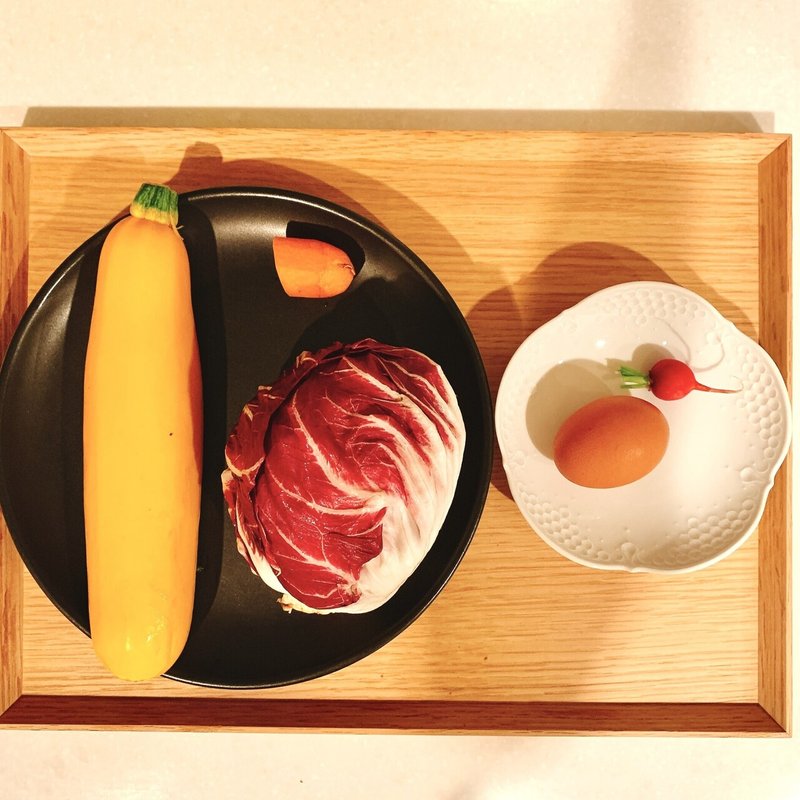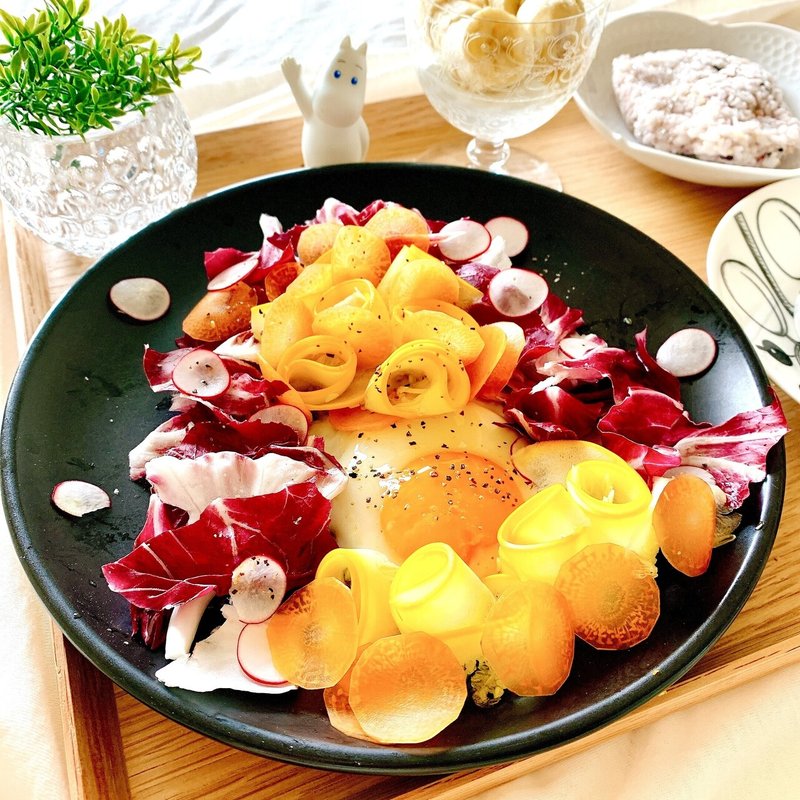 今日の朝食 目玉焼きとトレビスとズッキーニリボンのフラワーサラダ Masako Note