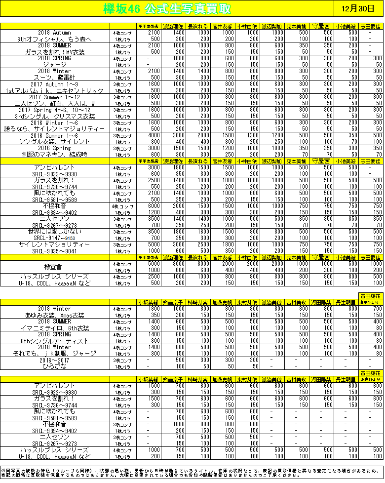欅坂46 生写真 最新レート一覧 売買 トレード用 坂道fan