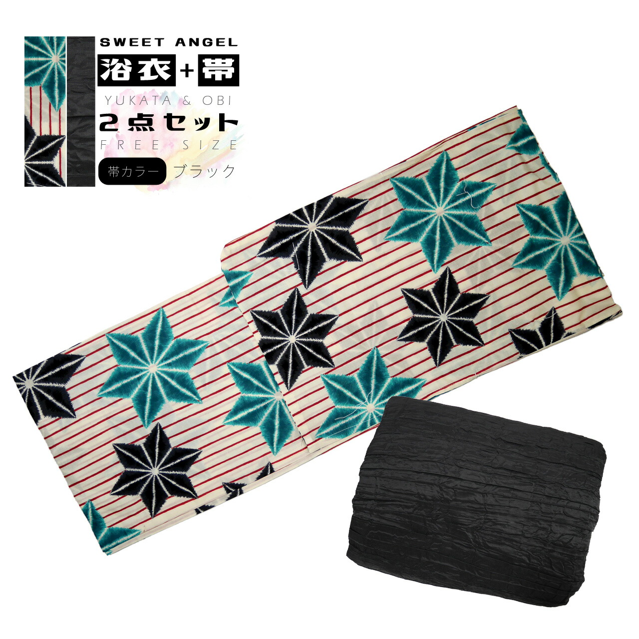 お得な レディース 浴衣2点セット 女性浴衣 帯 縞模様 黒 淡 緑 赤縞 生成り地 Fa 035 浴衣 ゆかた ユカタ Ladies レディス 浴衣セット レデイース レトロ Set 帯 しわ兵児帯 くしゅくしゅ ふわふわ しわへこ帯 おび Tajikhome Com