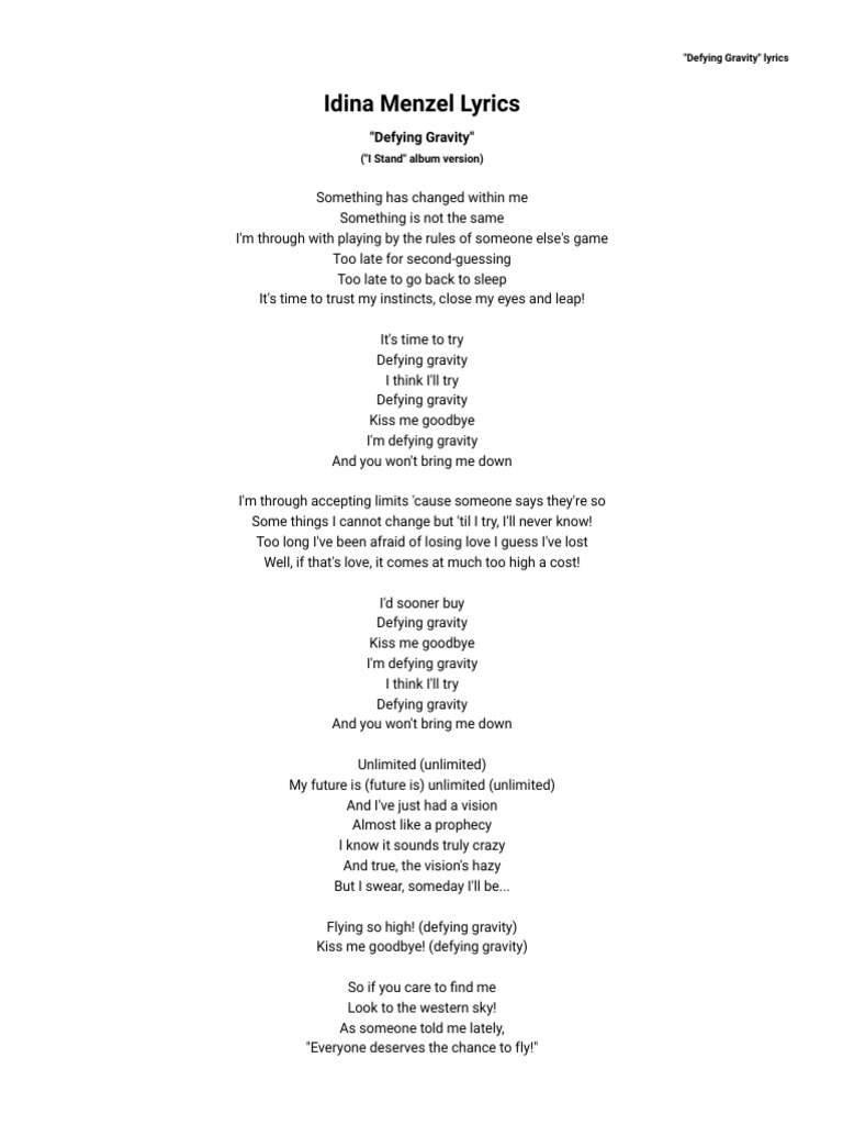 Idina Menzel Defying Gravity Lyrics Pdf