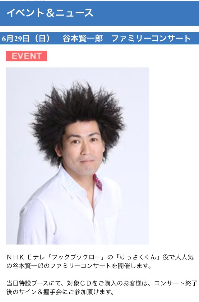 Nhk eテレ「フック ブック ロー」の“けっさく君”でおなじみの谷本賢一郎(たにけん)さんが、所沢ミューズに登場!子どもたちに大人気の谷本さんに、ファミリーコンサートの魅力や、歌への想い、少年時代の思い出などを伺いました。. 「フックブックロー」けっさく君 1974年4月23日、兵庫県佐用町出身。 nhk eテレ「フックブックロー」けっさくくん役として出演。.