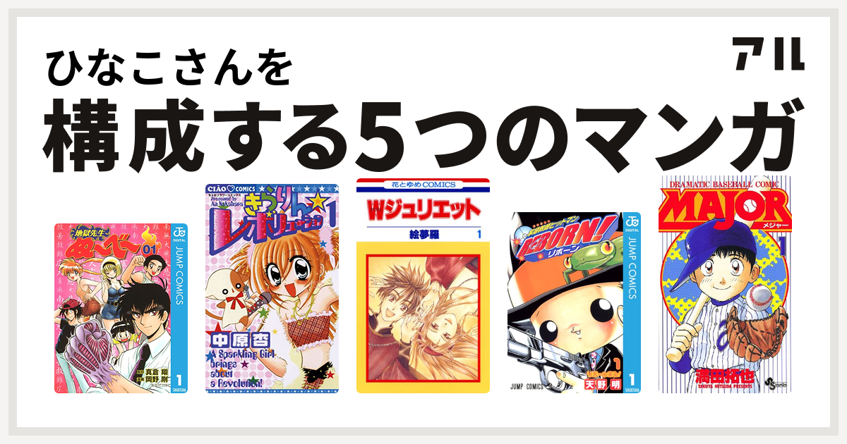 ひなこさんを構成するマンガは地獄先生ぬ べ きらりん レボリューション Wジュリエット 家庭教師ヒットマンreborn Major 私を構成する5つのマンガ アル