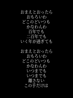 コトバのキモチ 愛しい人へ Et King おまえとおったらおもろいわ どこのどいつもかなわんわ 百年でも二百年でも いく年が過ぎても 歌ネット