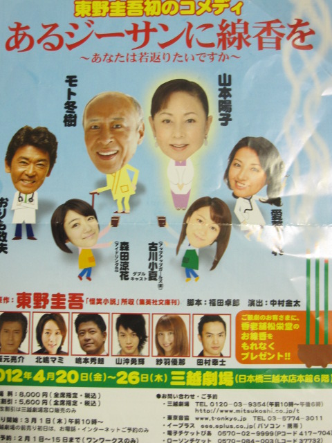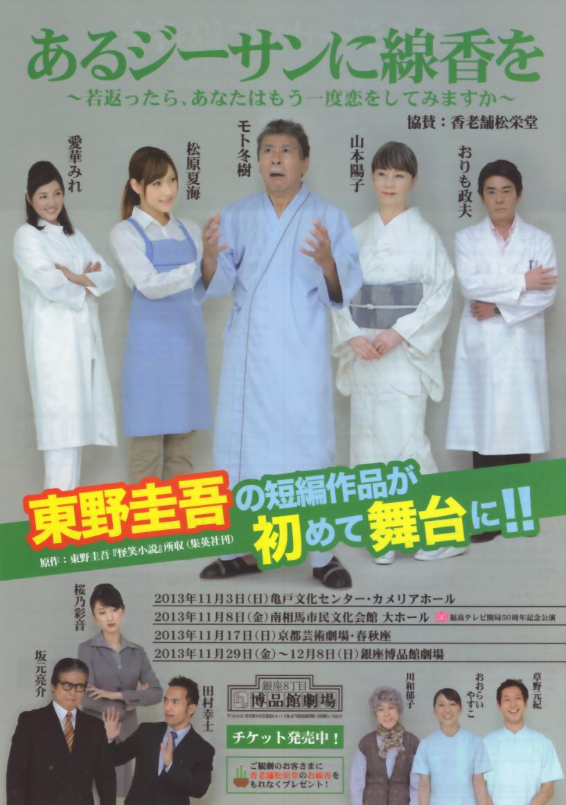 あるジーサンに線香をあるじーさんにせんこうを 「あるジーサンに線香を」(あるジーサンにせんこうを)は、『怪笑小説』に収録されている東野圭吾の短編小説。 初出は『小説新潮』1994年10月号。 同小説を元にした舞台が12年4月に初上演され〔「あるジーサンに線香を」 来年4月に向けて. あるジーサンに線香を(2) Posted on 12月 1st, 13 11/30 (土)、銀座博品館劇場でお芝居「あるジーサンに線香を」を観てきました。 今月の初めに亀戸のカメリアホールで初日を迎えた舞台です。 ※ 前回の記事 これは銀座公演に向けて後援会から贈った胡蝶.