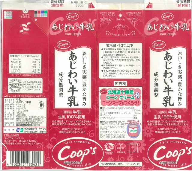 生活協同組合コープこうべ あじわい牛乳 16年08月 愛しの牛乳パック
